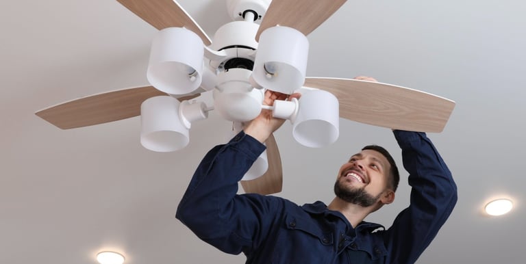 Services include outlet replacement, installation of ceiling fans (both new and existing setups), outdoor lighting, Christmas light setup, internet/Ethernet wiring, fixture replacements, chandelier installations, and more.
